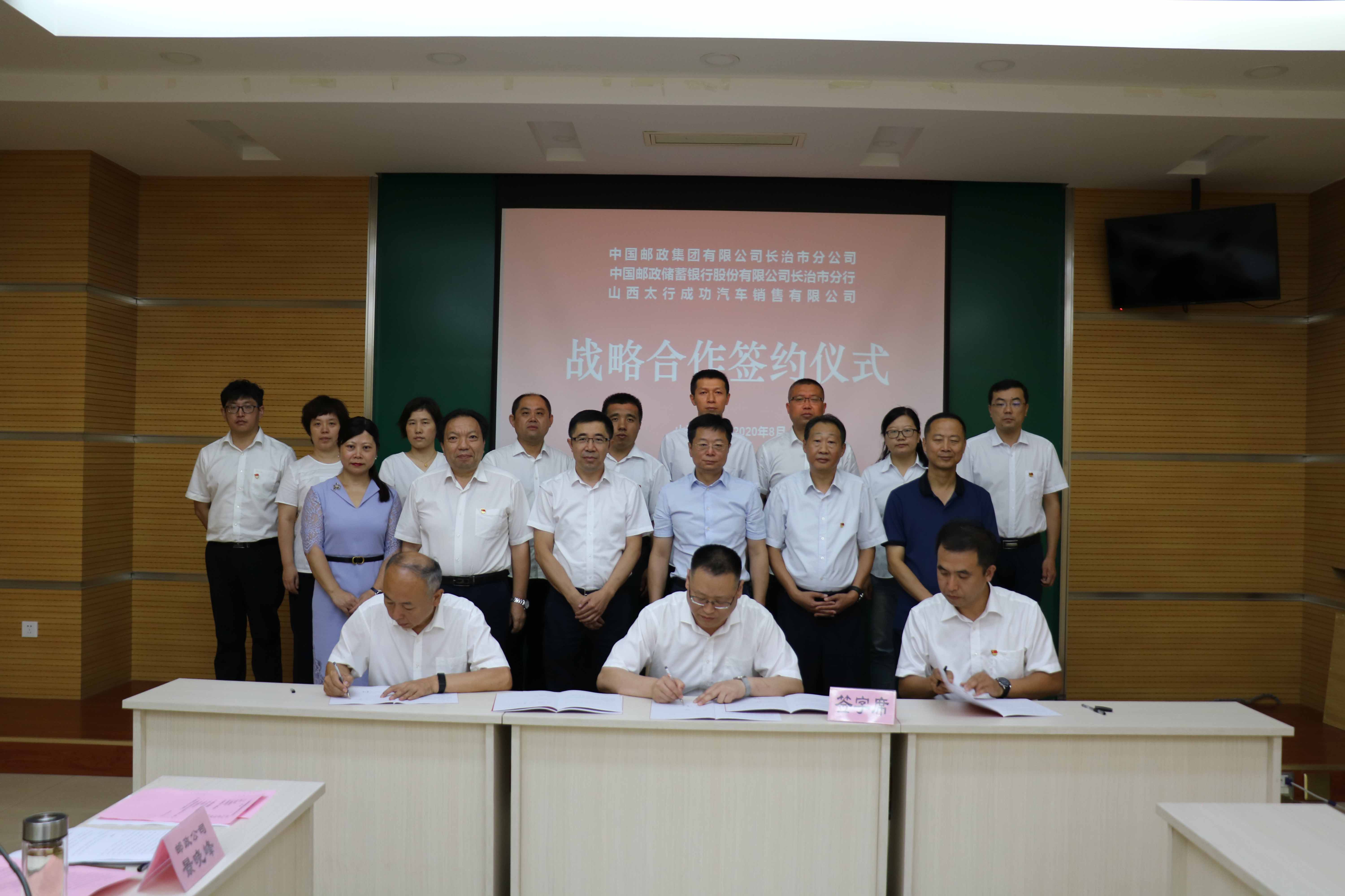 成功汽车销售公司与中国邮政集团公司长治市分公司、中国邮政储蓄银行股份有限公司长治市分行的战略合作签约仪式于8月13日上午在中国邮政长治分公司会议室隆重举行。中国邮政长治分公司总经理王宝明、邮储银行长治分行行长田鸥和williamhill官网副总裁马帅、williamhill官网汽车事业部副总经理、成功汽车销售公司总经理雷伟以及成功汽车销售公司副总经理田林、财务总监程孔香等出席了签约仪式。