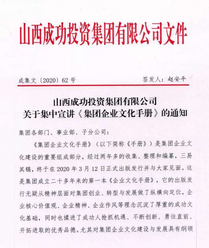 近日,集团专门下发了《关于集中宣讲<集团企业文化手册>DE通知》,《通知》指出,《集团企业文化手册》(以下简称《手册》)是集团企业文化建设的重要组成部分,经过两年多的收集、整理和编纂,三易其稿,终于在2020年3月12日正式出版发行并与大家见面。这是集团成立二十多年来的第一本《企业文化手册》,它的出版发行无疑从精神层面对集团创业、转型与发展做了纵横向定位,企业核心价值观、企业精神、企业作风等理念沉淀了厚重的成功文化基础,同时也揉进了成功人抢抓机遇、不断创新、勇往直前、开拓进取的优秀品德。尤其对集团企业文化建设与发展具有纲领性的作用,是集团企业文化建设与发展重要的思想支撑和理论支柱。