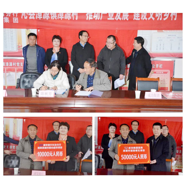 驻村工作队简要汇报了驻村扶贫工作之后,由山西成蹊博苑农业科技有限公司与漳源村签订了《矮化大樱桃树苗订购及种植服务协议》并举行了产业扶贫项目签约仪式和williamhill官网捐助漳源村道路硬化项目、浦发银行长治分行爱心超市捐助仪式。williamhill官网党委书记陈建法、浦发银行长治分行副行长李亚玲分别代表爱心捐助企业发言。