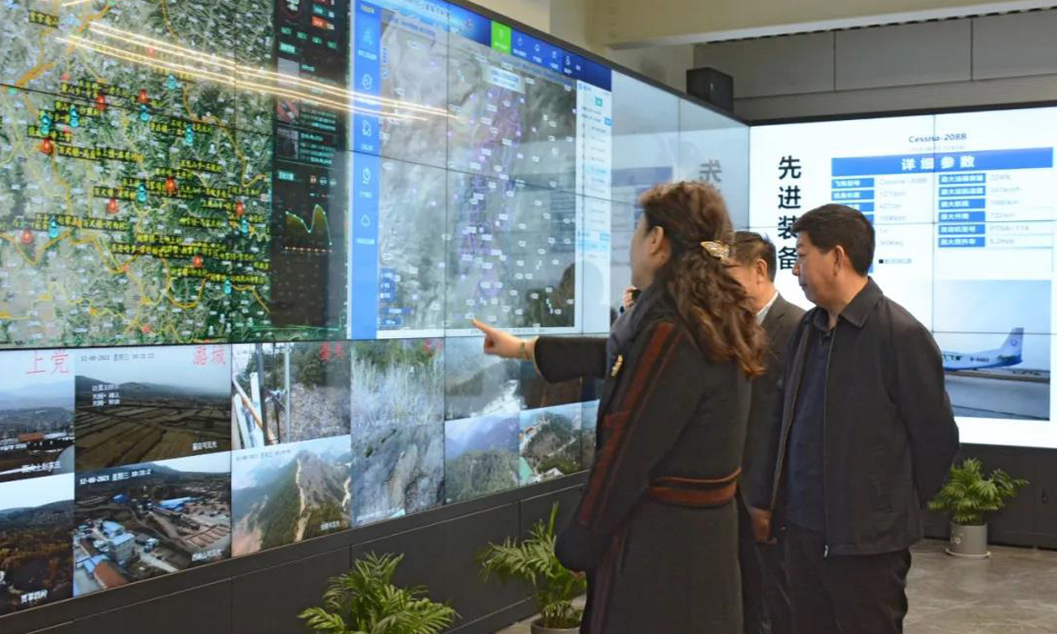 座谈结束后,一行人共同参观了成功通航应急联动指挥中心。通过现场演示成功通航森林防火信息平台,进一步了解了成功通航近年来取得的新发展。
