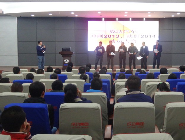 12月5日下午,销售公司在长治车厂二楼报告厅举行了《成功汽车“冲刺2013、 决胜2014”》动员大会。集团总裁助理周正江、汽车事业部总经理雷伟出席,销售公司副总郭步青主持会议。