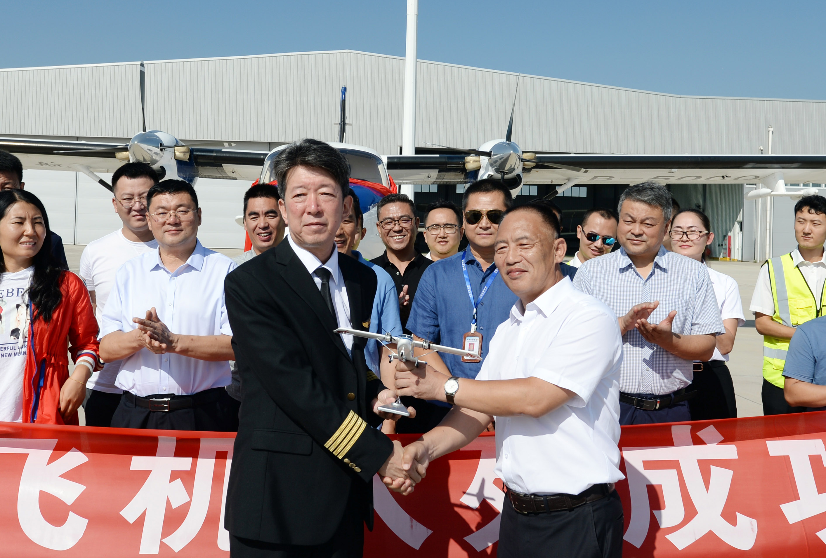 成功通航引进哈飞Y12E飞机交接仪式于9月4日在太原尧城机场举行。成功通航副总经理吴建生与哈飞副总经理刘辉南进行了飞机交接,双方负责人发表了热情洋溢的讲话。山西省人工降雨防雹办公室主任孙鸿娉、李培仁、副主任王功娃、太原航校校长郑全胜、马建兴,三晋通航总经理胡建华,太原航空仪表有限公司部长孔宪书,哈飞集团副总经理刘辉南,部长阴长庆,长清生物董事长史晓军和成功通航董事李建宏、石磊、马杰等嘉宾共同见证。