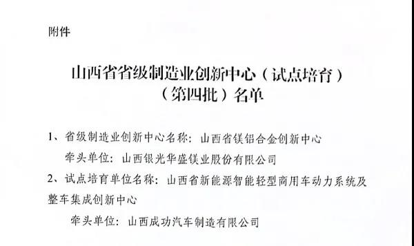 2021年12月26日,山西省工业和信息化厅下发了《关于公布山西省省级制造业创新中心(试点培育)(第四批)名单的通知》,通知指出,根据《关于开展山西省省级制造业创新中心创建工作的实施方案》和《关于组织开展山西省制造业创新中心(第四批)试点的通知》要求,在有关单位自主申报、地市推荐的基础上,经研究,确定山西省新能源智能轻型商用车动力系统及整车集成创新中心为省级制造业创新中心试点培育单位。根据文件精神,评为创新中心(试点)的单位享受政府的引导和扶持。